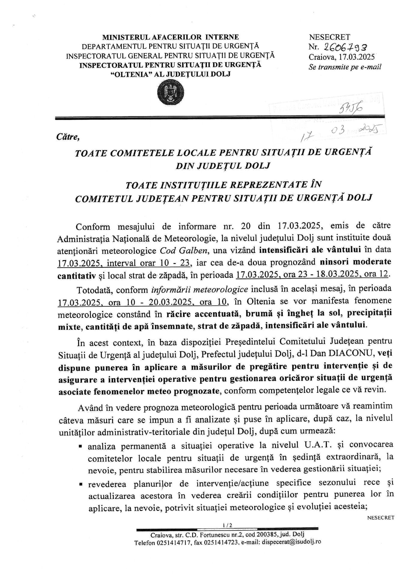 Atentionare meteorologica COD GALBEN: ninsori moderate cantitativ si local strat de zapada. Valabilitate: 17.03, ora 23:00 - 18.03, ora 12:00. ISU DOLJ