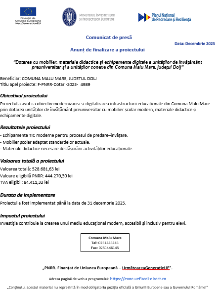 8. Proiect executare sală de sport în comuna Malu Mare având 180 locuri: